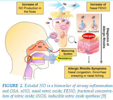 FIGURE 2. Exhaled NO is a biomarker of airway inflammation and OSA. nNO, nasal nitric oxide; FENO, fractional concentration of nitric oxide; iNOS, inducible nitric oxide synthase [9]