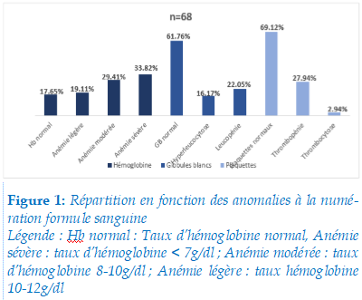 Des anomalies biologiques retrouvées à la numération formule sanguine étaient dominées par une anémie sévère, une thrombopénie et une leucopénie dans respectivement 33,82%(23/68), 27,94%(19/68) et 22 ,05%(15/68) des cas (Figure 1). On notait une pancytopénie dans 23,52%(16/68) des cas.