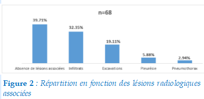 A la radiographie du thorax de face, les lésions étaient bilatérales dans 35,29%(24/68) des cas. Elle présentait des lésions associées dans 60,29%(41/68) des cas. Ces différentes lésions associées sont consignées dans la figure 2.