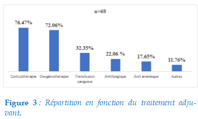 Sur le plan thérapeutique, tous nos patients avaient reçu un traitement anti tuberculeux de première ligne. Ce traitement a été débuté dès l’admission dans 95,59%(65/68) des cas. Le traitement adjuvant a été dominé par la corticothérapie et l’oxygénothérapie