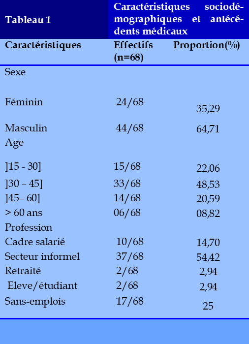 Durant la période d’étude, sur 996 patients tuberculeux qui ont été hospitalisés au service de pneumologie du CHU de Cocody, 68 patients ont été traités pour une miliaire tuberculeuse. La fréquence a été de 6,83% durant notre période d’étude. On notait une prédominance masculine à 64,71%(44/68) avec un sex-ratio de 1,83. La moyenne d’âge était de 41,41 ans avec des extrêmes de 19 et 84 ans. La tranche d’âge de [30-45] ans représentait 48,53% (33/68) des cas. Les travailleurs du secteur informel et les sans-emplois représentaient respectivement 54,42%( 37/68) et 25%(17/68) (Tableau 1).