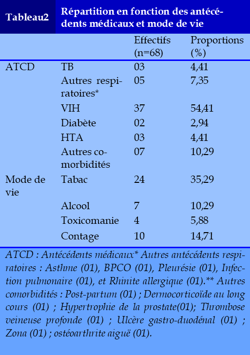 Le VIH représentait 54,41%(37/68) des comorbidités, suivi de l’hypertension 10,20%(03/68) et du diabète 06,12%(02/68). Les patients étaient des nouveaux cas de tuberculose à 95,59%(65/68). Le tabagisme était présent dans 35,29%(24/68) des cas. La notion de contage tuberculeux chez 14,71%(10/68) (Tableau2)