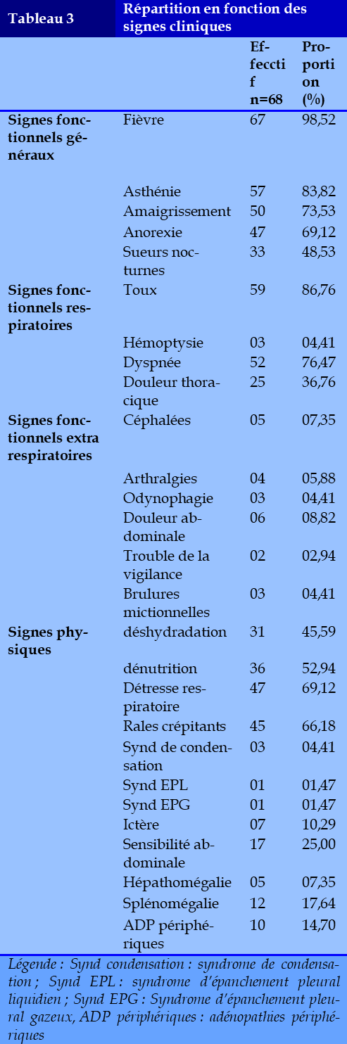 Les signes fonctionnels étaient de trois ordres. D’abord, les signes fonctionnels généraux, fait de la fièvre en tête de liste suivi de l’asthénie puis l’amaigrissement dans respectivement 98,52%(67/68), 83,82%(57/68), 73,53%(73/68). Ensuite, les signes fonctionnels respiratoires dont les plus rencontrés étaient la toux, la dyspnée dans respectivement 86,76%(59/68), 76,47 %(52/68) des cas. Enfin, les signes fonctionnels extra respiratoires dans 32,35 %(22/68) des cas, dominés par la douleur abdominale dans 8,82%(6/68) des cas (tableau 3).