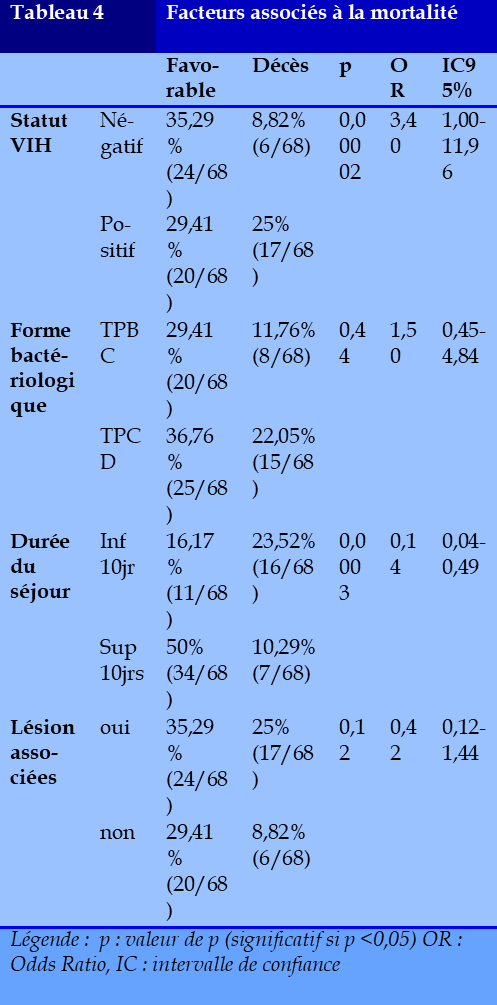 Les facteurs associés à la mortalité étaient la sérologie VIH positive (p=0,00002) et la durée du séjour inférieur à 10 jours (p=0,0003) (Tableau 4).
