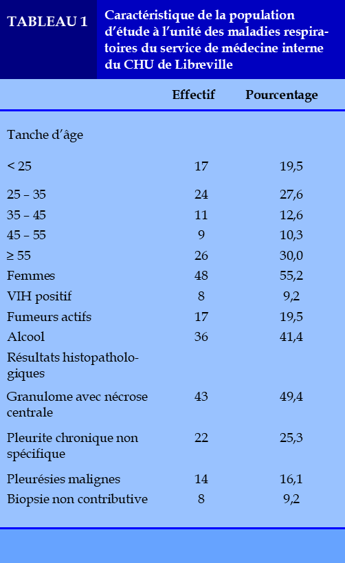 Il s’agit d’une étude descriptive transversale à collecte des données rétrospectives à partir des dossiers archivés et des registres d’hospitalisation de l’unité des maladies respiratoires du service de médecine interne, du CHU de Libreville. L’étude s’est déroulée sur une période d’activité de 12 mois allant de 2023 à 2024 au cours de laquelle 735 patients ont été admis en hospitalisation. Quatre-vingt-dix-huit dossiers des patients atteints d’épanchement pleural liquidien non suppuré ont été archivés. Les critères de sélection étaient une pleurésie à liquide exsudative, non suppurée quel que soit le statut immunitaire. Le diagnostic de pleurésie a été reconnue cliniquement par la mise en évidence d’un syndrome d’épanchement pleural liquidien confirmé par la radiographie du thorax de face et la ponction pleurale exploratrice. Il a été systématiquement demandé, la chimie, la cytologie et la bactériologie. Le caractère exsudatif a été affirmé par un taux de protéines pleurales supérieur à 30g/l. La recherche des bacilles acido-alcoolo-résistants sur les prélèvements histologiques et la recherche des cellules malignes dans le liquide pleural n’ont pas été réalisée. La biopsie pleurale a été réalisée à l’aveugle avec des prélèvements multiples (quatre minimum) sous contrôle de l’hémostase à l’aiguille d’Abrams en respectant les règles d’aseptises rigoureuses. Les prélèvements ont été fixé au formol. Aucune biopsie pleurale percutanée n’a été guidée par une imagerie (échographie ou scanner thoracique). Les résultats d’anatomie pathologie des pièces de biopsies pleurales ont été répartis en quatre classes ; malin lorsque le diagnostic a été affirmé par la présence des cellules malignes, lésions inflammatoires spécifiques en présence des follicules épithélioïde et gigantocellulaire avec ou sans nécrose caséeuse centrale (tuberculose pleurale), en lésions inflammatoires non spécifiques (pleurite chronique) et pas de diagnostic lorsqu’aucune lésion n’a été retrouvé sur les prélèvements. Toute biopsie était considérée comme interprétable ou dite « rentable » lorsque l’examen histopathologique a permis de retenir le diagnostic d’une inflammation chronique spécifique (pleurésie tuberculeuse), ou non spécifique (pleurite chronique) et enfin présence des cellules malignes (pleurésie néoplasique). Elle était considérée comme non interprétable lorsqu’aucune lésion histologique n’a été retrouvée. Les données-patients comprenaient : l’âge, le genre, les données cliniques (les signes fonctionnels, le siège de l’épanchement pleural, la couleur du liquide pleurale, le statut VIH, les comorbidités, les délais de consultation et de diagnostic), les résultats histopathologiques de la biopsie (rentable versus non rentable). Ainsi, 11 dossiers des patients atteints d’épanchement pleurale à liquide claire, exsudatif non suppuré ont été d’emblée exclus de l’étude réduisant à 87 cas l’effectif de notre échantillon de base. L’analyse statistique a été rendu possible grâce au logiciel SPSS 25. Les variables qualitatives étaient affectées de leur effectif et proportion et les variables quantitatives étaient affectées de leur paramètre de dispersion et de leur tendance centrale. Un seuil p<0,05 était considéré comme statistiquement significative entre les différents paramètres étudiés. L’étude était réalisée dans le respect des règles d’éthique. Enfin, la confidentialité et l’anonymat des informations recueillies dans chaque dossier ont été respectés par l’utilisation de codage numérique.