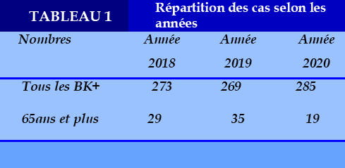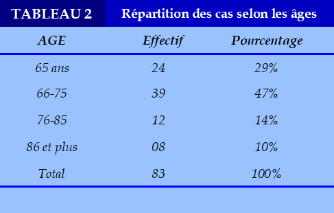 L’âge moyen des patients étaient de 65 ans avec les extrêmes 65 ans et 96 ans).