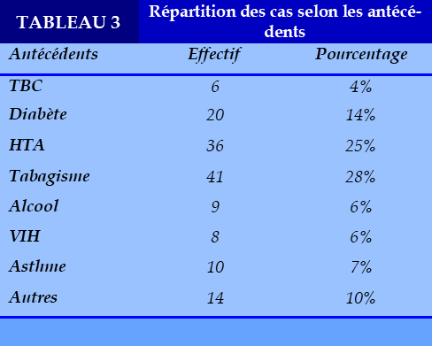 Dans notre étude 6 patients soit 4% avait un antécédent de tuberculose pulmonaire traité et déclaré guéri.