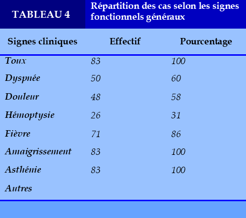 Dans notre étude 6 patients soit 4% avait un antécédent de tuberculose pulmonaire traité et déclaré guéri. La sérologie VIH, effectuée chez tous les patients était positive chez 8 patients soit 6 % des cas. Le tabagisme représentait 28 %. 20 patients avaient un diabète soit 14%. Le motif de consultation était une toux productive suivi de l’asthénie et amaigrissement dans 89% des cas. Sur le plan radiographique, 97,5% des patients ont présenté des images anormales, La majorité des lésions étaient bilatérales. Les lésions les plus observées ont été des opacités parenchymateuses aussi bien à droite qu’à gauche. Les images étaient hétérogènes et non systématisés dans 68,5%. Tous les patients ont bénéficié d’un bilan pré thérapeutique avant la mise en route du traitement anti tuberculeux.