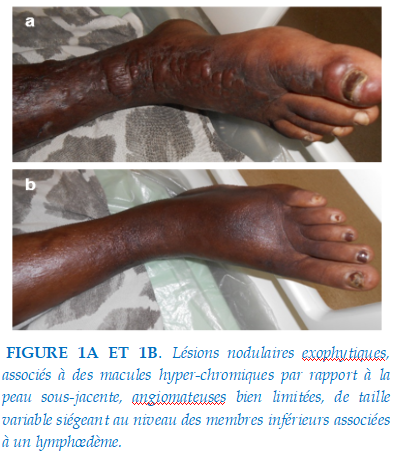 Madame F.S., âgée de 30 ans, hospitalisée pour des lésions cutanées évoluant depuis cinq mois auparavant ; ayant débuté par une macule puis une papule pour devenir nodulaire, associée à une altération de l’état général sans notion de fièvre. Elle n’avait pas d’antécédents particuliers notables. A l’entrée, l’indice de Karnowsky était à 60%. Il s’agissait des lésions nodulaires exophytiques, fermes, indolores associés à des macules hyper-chromiques par rapport à la peau sous-jacente, angiomateuses bien limitées, de taille variable siégeant au niveau des membres inférieurs associées à un lymphœdème (Fig. 1a et 1b).
