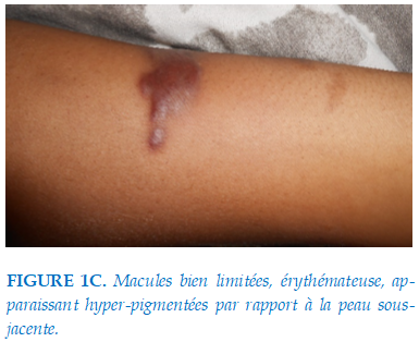 Aux membres supérieurs ; on avait des macules bien limitées, érythémateuse, apparaissant hyper-pigmentées par rapport à la peau sous-jacente, indolore et non prurigineuses de taille variable (Fig. 1c).