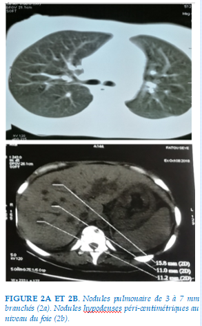 Biologiquement on notait une anémie sévère microcytaire hypochrome (Hb = 7,0g/dl, VGM = 73,7µ3, TCMH = 24,2pg), une thrombopénie sévère (49.000/µl3) sans signes de diathèse hémorragique, une lymphopénie à 186/mm3, une hypocalcémie à 1,55 mmol/l, une hyperphosphorémie à 1,51 mmol/l. Le GeneXpert réalisé dans l’expectoration n’a pas mis en évidence la présence du génome de Mycobacterium tuberculosis. La sérologie rétrovirale était positive au VIH1, le taux des CD4 était à 86/mm3, la charge virale était à 3.413.527 copies/ml. Les sérologies des virus des hépatites B et C étaient négatives. Le scanner thoracoabdominal montrait en fenêtre parenchymateuse, la présence dans le poumon droit de nodules de 3 à 7 mm branchés (Fig. 2a).