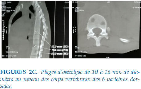 En coupes abdominales hautes une douzaine de nodules hypodenses péri-centimétriques au niveau du foie (Fig. 2b) et en fenêtre osseuse des plages d’ostéolyse de 10 à 13 mm de diamètre au niveau des corps vertébraux des 6 vertèbres dorsales (Fig. 2c). La biopsie des nodules cutanés montrait un épiderme d’aspect normal, alors que le derme et l’hypoderme étaient le siège d’une prolifération de petits vaisseaux capillaires parfois monocellulaire, accompagnée d’érythrodiapédèse. Le revêtement endothélial était turgescent. Il s’y associait un infiltrat de cellules fusiformes ou globuleuses organisées en faisceaux ou plages et accompagnées de quelques lymphocytes et plasmocytes. Le traitement antirétroviral à base d’inhibiteur de protéase booster au ritonavir avait été institué associé à une prophylaxie des autres affections opportunistes et à l’acide folinique à la dose de 25 mg/jour. Du fait de la sévérité du tableau clinique une polychimiothérapie à base de l’association Doxorubicine – Bléomycine – Vinblastine avait été décidée. La patiente décède six jours après l’admission dans un tableau de détresse respiratoire aiguë.