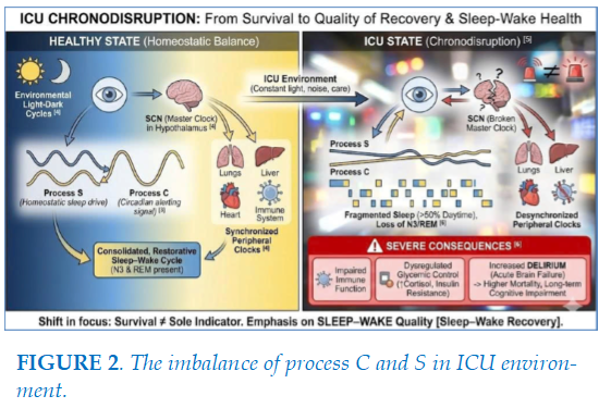 through the interaction of the homeostatic process (Process S) and the circadian process (Process C) [3] (Figure 2). In the intensive care unit (ICU), patients confront a condition scientists term "chronodisruption" [5]. This is not merely sleep deprivation but a total collapse of the endogenous timekeeping system. 24-hour polysomnography (PSG) studies demonstrate that ICU sleep architecture is extremely fragmented, with over 50% of sleep occurring during daytime hours, and restorative stages such as slow-wave sleep (N3) or REM sleep are frequently diminished or entirely absent [6]. This disruption leads to severe biological consequences: impaired immune function, dysregulated glycemic control via insulin resistance induced by elevated cortisol, and notably, an increased risk of delirium—an acute brain failure linked to higher mortality rates and long-term cognitive impairment [6].