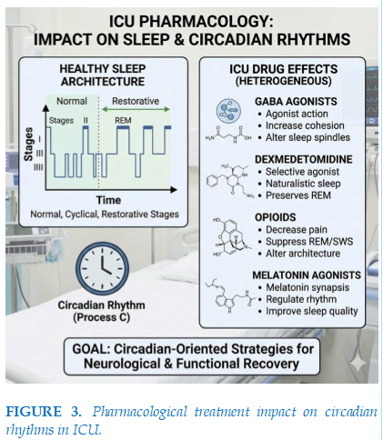 Pharmacological agents commonly used in the ICU, including sedatives, analgesics, and other neuroactive medications, play a central role in facilitating patient comfort and tolerance of life-sustaining interventions such as mechanical ventilation. However, accumulating evidence indicates that many of these agents exert heterogeneous—and often adverse—effects on sleep architecture and circadian regulation, with important implications for neurological and functional recovery [2,3]. These effects are not uniform and depend on whether agents suppress, mimic, or attempt to restore physiological sleep–wake regulation. GABA Agonists: Propofol and Benzodiazepines (such as midazolam) function by stimulating gamma-aminobutyric acid (GABA) receptors, inducing a potent state of central nervous system depression [1]. Although patients appear to be sleeping, electroencephalogram (EEG) recordings reveal a state more akin to anesthesia than natural sleep. Specifically, these agents severely suppress REM and slow-wave sleep (SWS/N3) [1]. A pharmacokinetic study of prolonged propofol infusion in the ICU found no day-night variation in metabolic concentrations, and the bispectral index (BIS)—a measure of sedation depth—similarly lost its rhythmicity [7]. This implies the drug effectively erases the day-night boundary within the patient's brain. Prolonged propofol infusion abolishes normal day–night variability in electroencephalographic and pharmacodynamic markers, reflecting a loss of circadian modulation of central nervous system activity [7]. Dexmedetomidine is a selective α2-adrenergic agonist at the locus coeruleus, functioning by inhibiting norepinephrine release, thereby activating natural sleep-inducing pathways in the brainstem [8]. Unlike propofol, dexmedetomidine induces a sedative state where patients remain easily rousable to interact with medical staff [8]. Direct comparative studies have demonstrated that dexmedetomidine increases sleep efficiency, enhances N2 sleep stages, and preserves a portion of REM sleep compared to other drug classes [9]. More critically, utilizing dexmedetomidine over benzodiazepines is associated with a significant reduction in delirium incidence and shorter mechanical ventilation duration [10]. Melatonin receptor agonists have been shown to reduce delirium incidence and ICU length of stay without causing respiratory depression.