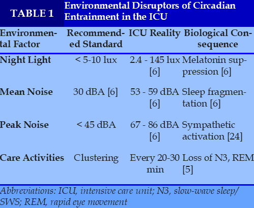 The ICU environment represents a biological paradox: insufficient light exposure during daytime contrasted with excessive illumination at night, combined with persistent background noise [6]. Such conditions profoundly disrupt external time cues (zeitgebers) that are essential for circadian entrainment. To illustrate how ICU environmental conditions deviate from established circadian-friendly standards, Table 1 contrasts recommended thresholds with real-world ICU measurements and their downstream biological consequences on sleep architecture and circadian alignment. Collectively, these deviations underscore the ICU environment as a potent yet modifiable driver of circadian disruption and sleep fragmentation in critically ill patients.