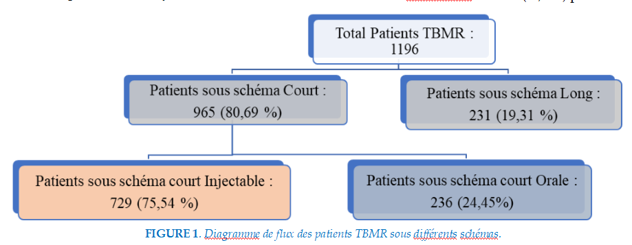 Results: 1,196 TBMR patients were included, of whom 965 (80.69%) were on a short regimen. The average age of our patients was 34 ± 10.37 years, and the most represented age group was 15 years and older, accounting for 98.55%. Males predominated, accounting for 71% (sex ratio: 2.13). The most commonly administered short injectable regimen (729, 75.5%) was 4KmMfxPtoCfzHZE/5MfxCfzZ, and the most commonly administered short oral regimen (236, 24.6%) was 4BdqLfxPtoCfzHZE/5MfxCfzZ. The outcome of treatment in our cohort was favourable in terms of therapeutic success in 74.62% of patients on the short injectable regimen and 73.82% of patients on the short oral regimen.