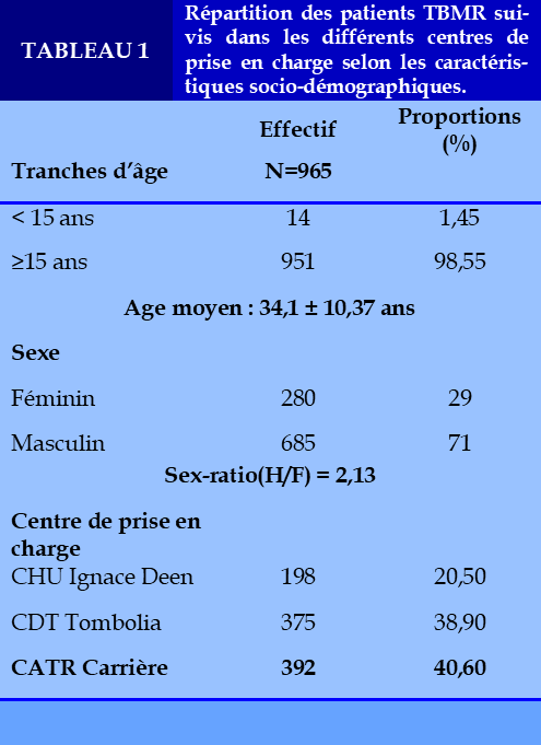 Résultats : Au total 1196 patients TBMR ont été colligé dont 965 (80,69 %) sous schéma court. L’âge moyen de nos patients (34 ± 10,37 ans) et tranche d’âge la plus représentée était celle supérieure ou égale à 15 ans soit 98,55 %. La prédominance était masculine 71% (Sex-ratio :2,13)