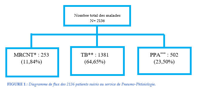 Méthodologie: Il s’est agi d’une étude de cohorte de type descriptive à collecte rétrospective ayant inclus tous les patients atteints des MRCNT durant la période 2018-2022. Les MRCNT comportent la BPCO, les séquelles de tuberculose, l’asthme, la fibrose pulmonaire, cancer broncho-pulmonaire et la dilatation des bronches.